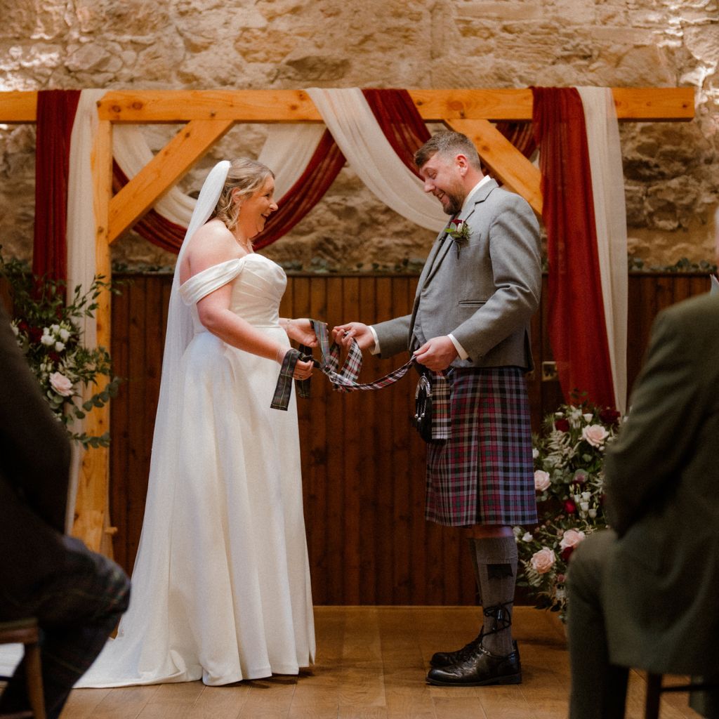 A handfasting can be incorporated into your wedding ceremony by your wedding celebrant. There are several different methods, with different ways ribbons can be tied. However the meaning is always the same – to symbolise your commitment and love through the tying of ribbons.
